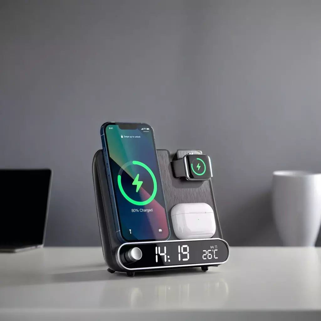 Der kompakte Wireless-Ladeständer bietet die perfekte All-in-One-Lösung zum Laden von Smartphone, Smartwatch und Kopfhörern. Mit einem maximalen Ausgang von 15W für schnelles Laden und Typ-C-Anschluss für moderne Konnektivität ist er ideal für Zuhause oder Büro. Das elegante Design kombiniert Funktionalität und Stil, während die hochwertige Verarbeitung Langlebigkeit garantiert. Perfekt organisiert dank eines einzigen Geräts für alle deine Ladebedürfnisse.